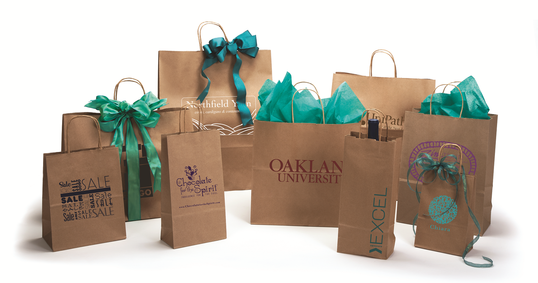 Natural Kraft Paper shopping bags made with a minimum 40% post-consumer recycled content, serrated top edge, and twisted paper handles.