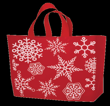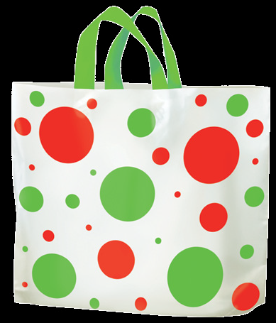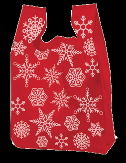 - Holiday Dots and Snowflakes! Poly Bags with Holiday designs. Contains 20-30% Recycled material. Made in USA. Available in T-Shirt Style, Totes and Jumbo bags!